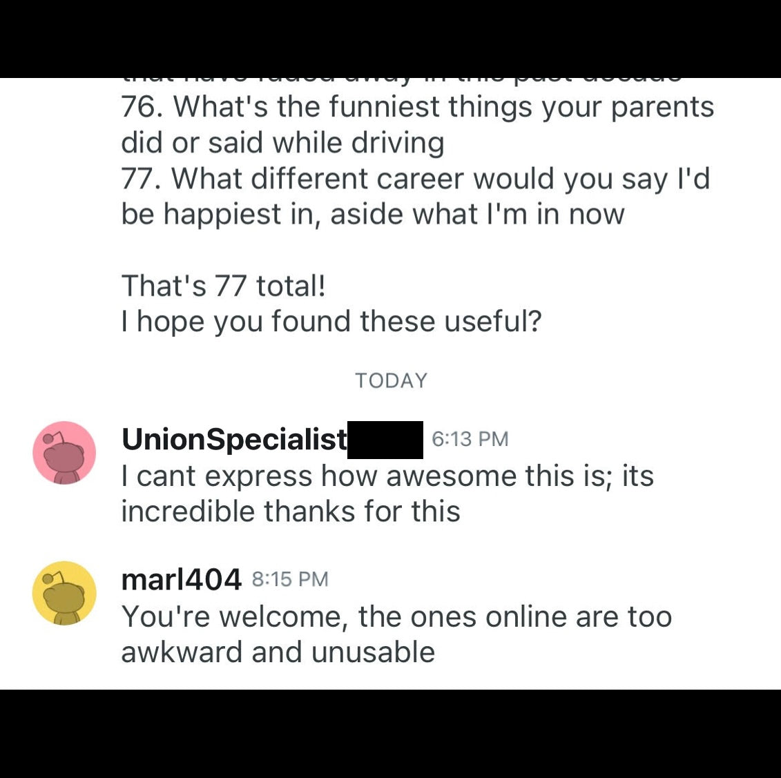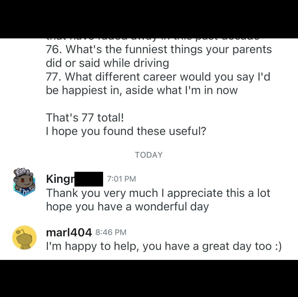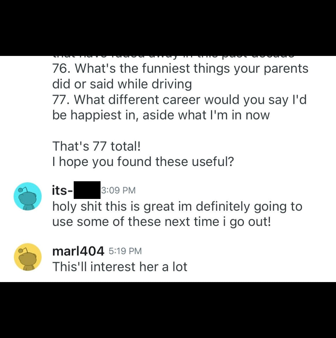 🔶 1. What was your first car .. where's the coolest place you snuck off to with it 🔶 2. What movie villain pops up in your mind the most .. what character fascinated you most growing up 🔶 3. Are you a dog or cat person .. what two wild animals best represent your personality 🔶 4. Whats the biggest scam you ever fell for .. what do you see people buying that has a way better alternative or deal 🔶 5. Do you have a paranormal story .. Whats something that if you think about, will give you immediate chills and feel something is now there, around you 🔶 6. Whats the dumbest thing you believed as a child .. what was your funny fear as a child 🔶 7. What menu items do you miss most .. whats your favorite fast food story